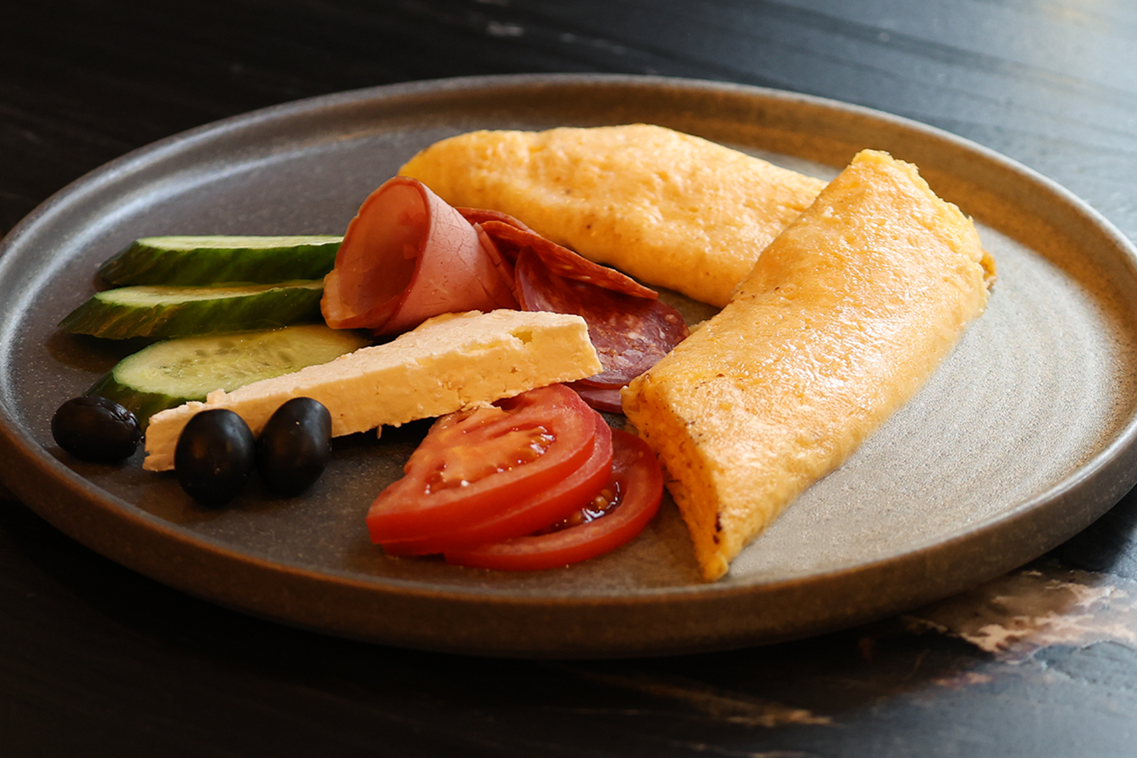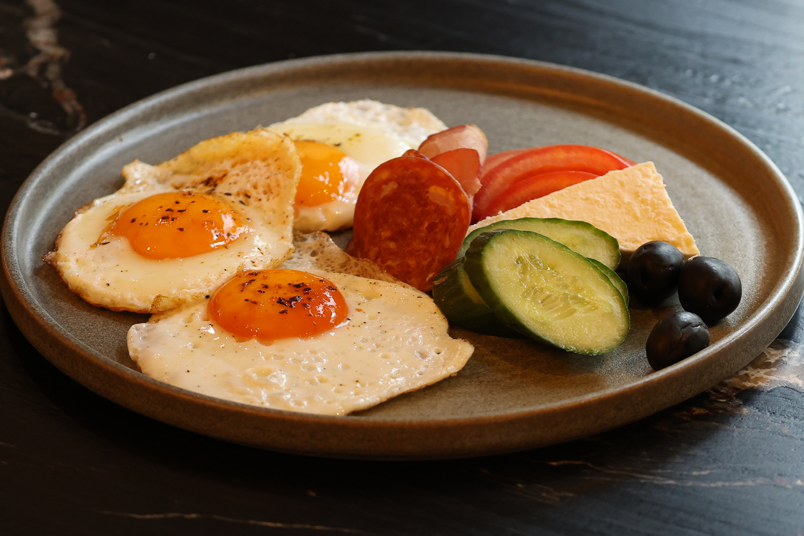 (Bukë e thekur, vezë, spinaq, salcë holandeze)