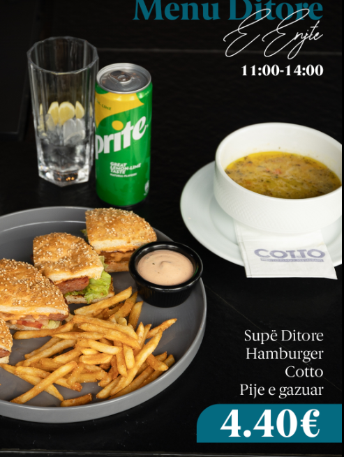 Bëhuni dëshmitar të artit të gatimit përmes shërbimit të kompletuar nga COTTO Brasserie & Restaurant. E vendosur në Ferizaj, gjegjësisht në qendrën tregtare The Village, gatimet e COTTO-s mund t'i shijoni në pjesën e ndarë veçmas në formë brasserie, apo në hapësirën e dedikuar si restaurant mesdhetar. Në COTTO Brasserie & Restaurant gjeni meny ushqimore e cila prek kuzhinat më popullore duke u sjellur një gamë të gjerë zgjedhjesh, si ushqimet tradicionale italiane, greke, turke, franceze, e spanjolle. Çdo përbërës i pjatave të shërbyera nga stafi i COTTO Brasserie & Restaurant përzgjedhet dhe përgatitet me kujdes të shtuar. Ushqimin tuaj mund ta shoqëroni me verërat tona më cilësore të importuara nga Italia dhe Franca, apo dhe ato të preferuara vendore.